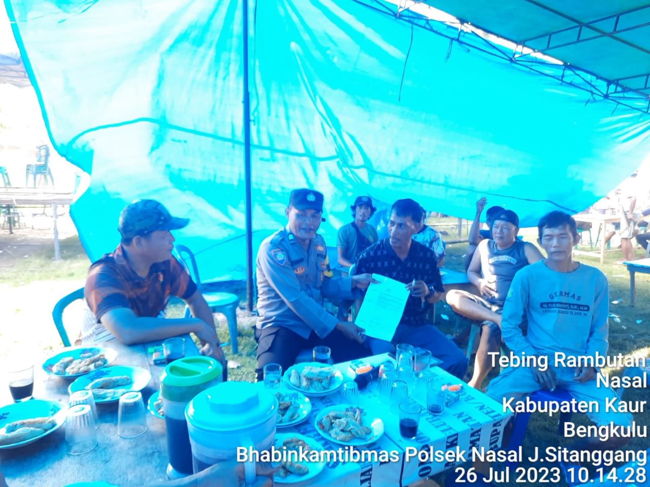 Kaur – Bhabinkamtbmas Polsek Nasal Polres Kaur Polda Bengkulu, Brigpol J. Sitanggang memberikan pelayanan Delivery (Antar Alamat) penerbitan Surat Izin Keramaian (SIK) Rabu, (26/07/2023) pukul 11.00 WIB.