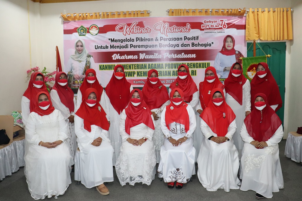 Bengkulu, Siberindo.co – Dalam rangka memperingati Hari Ulang Tahun Kemerdekaan Republik Indonesia (HUT RI) ke-76, Dharma Wanita Persatuan (DWP) Kantor Wilayah Kementerian Agama (Kanwil Kemenag) Provinsi Bengkulu mengikuti webinar Nasional yang diadakan oleh DWP Kemenag RI yang mengupas tema “Mengelola Fikiran, Perasaan untuk Menjadi Perempuan Berdaya dan Bahagia,” Kamis (26/8/2021).