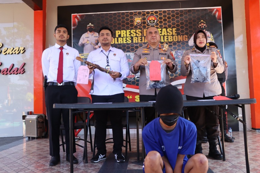 “Terduga pelaku AS diamankan bersama barang bukti 1 lembar aju berwarna hitam yang terdapat bercak darah, 1 lembar celana pendek dan sebilah senjata tajam sepanjang 47 CM dengan gagang kayu warna coklat,” terang Kapolres Rejang Lebong AKBP Tonny Kurniawan, didampingi Kasat Reskrim AKP Samson Sosa Hutapea dan Kasi Humas Iptu Bertha Ginting saat press release di Mapolres Rejang Lebong, Senin (26/9/2022).