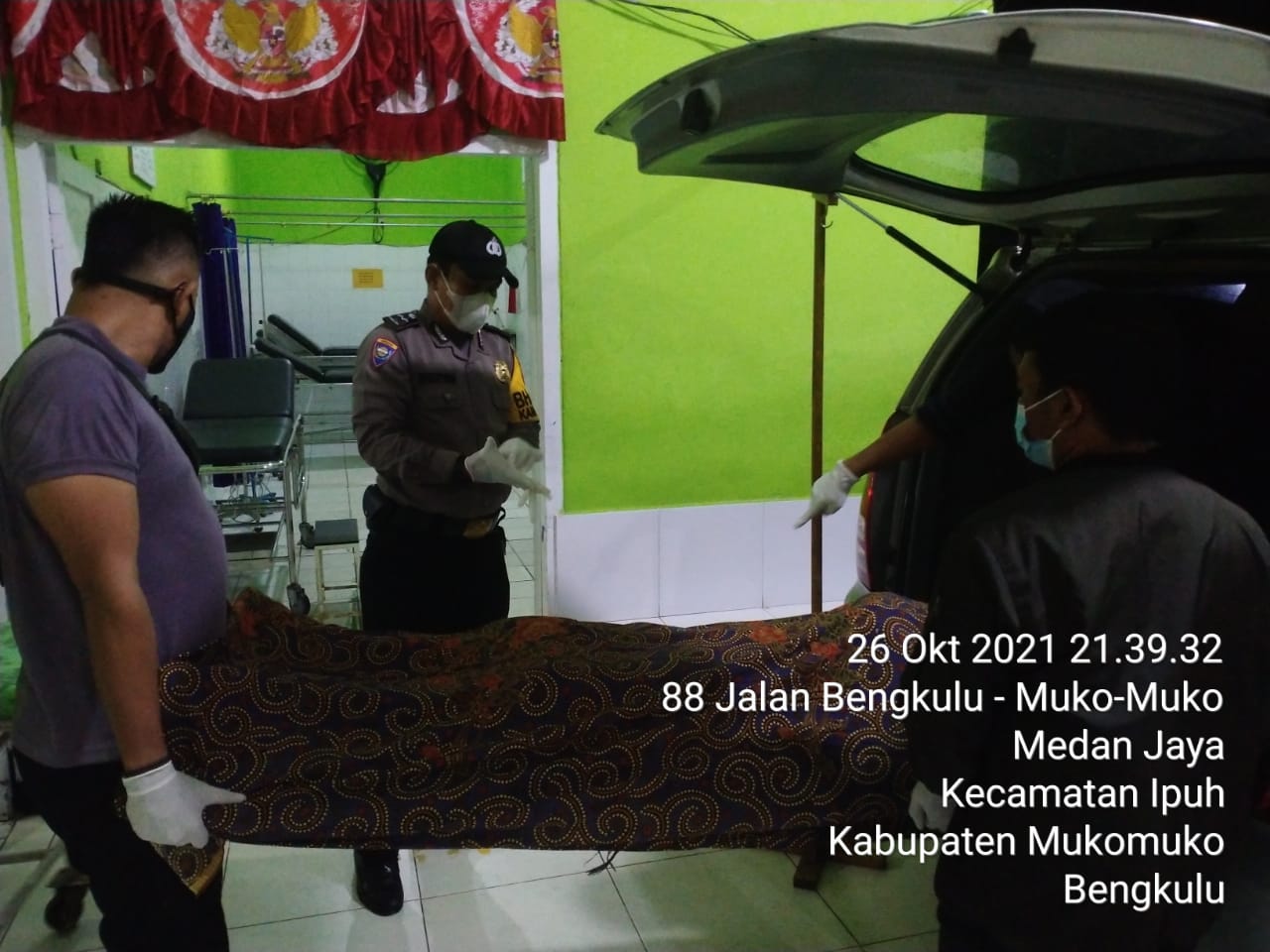 Kapolsek Iptu Fajri Ameli P, S.TK S.IK bersama Anggota Piket dan Bhabinkamtibmas Polsek Mukomuko Selatan langsung mendatangi lokasi dan menemukan korban gantung diri dengan menggunakan tali tambang yang di gantungkan di atas pintu ruang tamu.