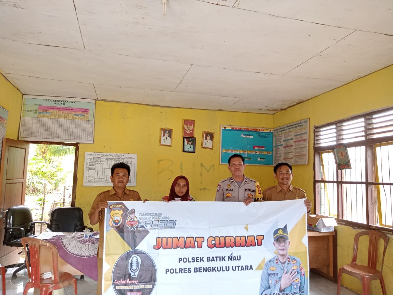 Bengkulu Utara – Pak Babin Polsek Batiknau Polres Bengkulu Utara Polda Bengkulu, mengelar acara Jumat curhat yang dilaksanakan dikantor Desa Ulak Tanding Kecamatan Batiknau Kabupaten Bengkulu Utara dengan mengumpulkan warganya untuk mendengarkan keluh kesahnya, Jumat (27/10/2023)
