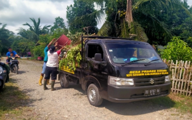 Sejak Tahun 2020 telah dialokasikan pengadaan empat unit mobil jenis pick up untuk pengangkut sampah, serta setiap rumah warga sudah kami sediakan tong sampah yang sudah kita alokasikan dananya melalui Dana Desa tahun lalu.