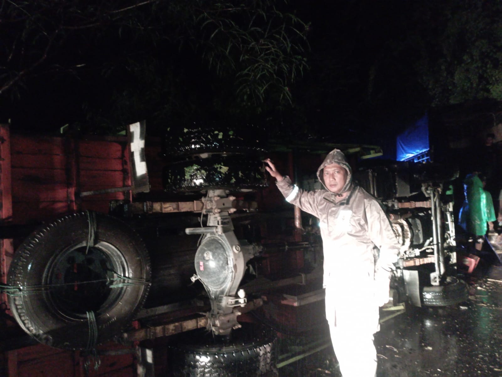 Lanjutnya, atas kejadian itu, petugas dari BPBD datang kelokasi dan melakukan evakuasi terhadap truk dan pembersihan jalan.