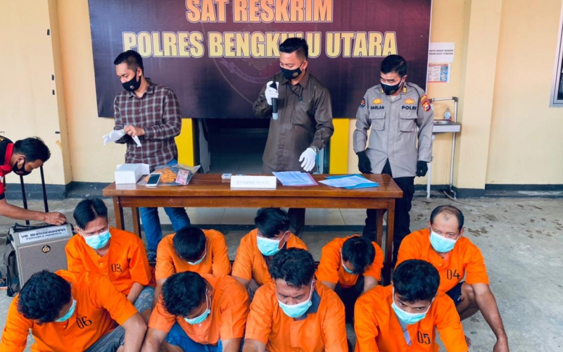 Kepolisian Resort Bengkulu Utara, Polda Bengkulu, mengamankan mucikari dan sejumlah pelaku tindak pidana perjudian. Sebanyak 8 warga diringkus saat tengah asik gelar perjudian jenis Samgong. Sementara mucikari diringkus saat mengantarkan teman wanitanya kepada pria hidung belang, Selasa (27/4/2021).