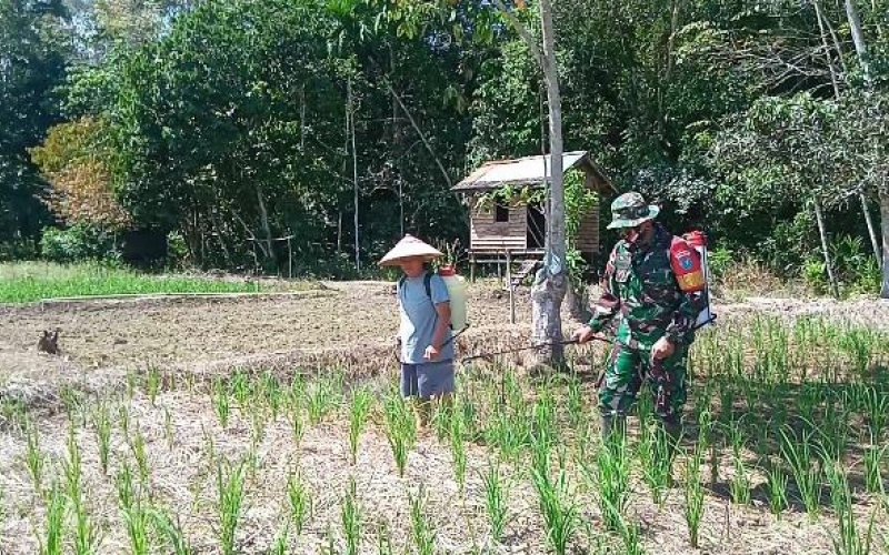Bintara Pembina Desa (Babinsa) Koramil 1206-06/Putussibau Utara, Praka Maksum melaksanakan pendampingan dengan aksi turun ke sawah dengan menyemprot tanaman padi milik Ibu Sinta.