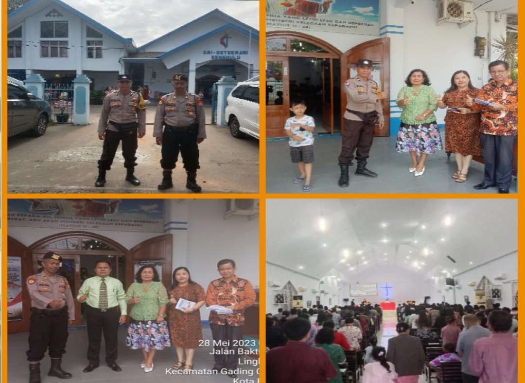 Bengkulu – Personel Polsek Gading Cempaka Polresta Bengkulu Polda Bengkulu, melaksanakan kegiatan pengamanan ibadah Mingguan umat Kristiani di Gereja Methodis Getsemani Jalan Bhakti Husada Kelurahan Lingkar Barat Kecamatan Gading Cempaka Kota Bengkulu, Minggu (28/5/2023).