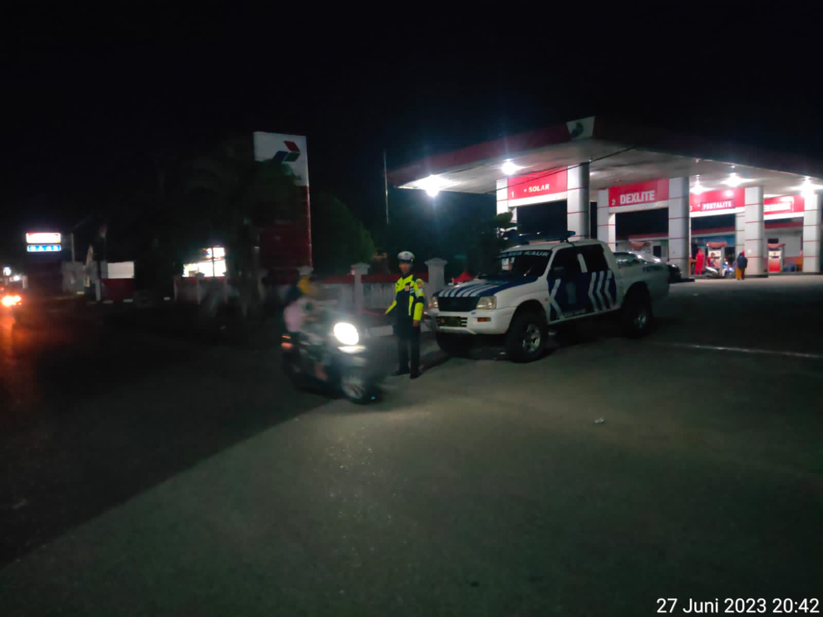 Kaur – Polres Kaur Polda Bengkulu, Melaksanakan Pantauan Arus Lalu Lintas dan Prokes di Jalan Raya Lintas Sumatera Kota Bintuhan, Sabtu (27/06/2023) Pukul 20.00 WIB s/d 21.00 WIB.