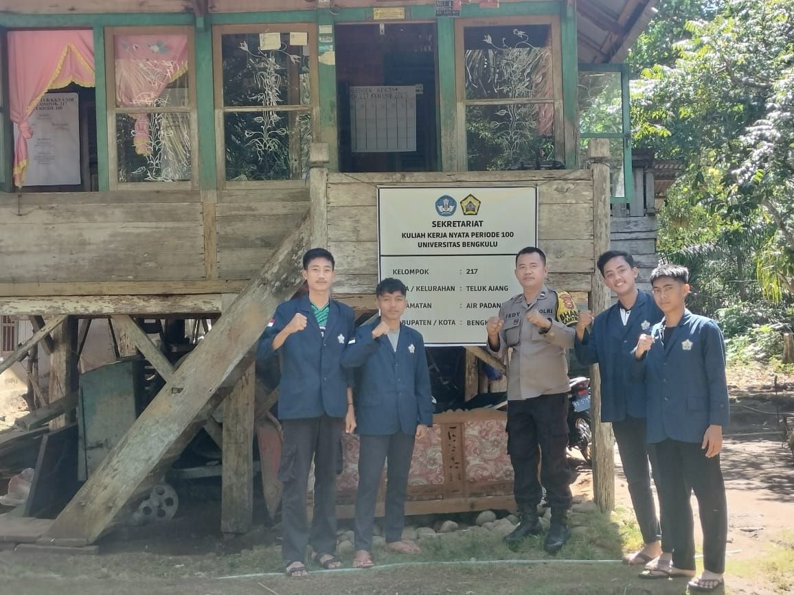 Bhabinkamtibmas Aipda menyambangi Mahasiswa KKN Unib kelompok 217 yang melaksanakan KKN di desa Teluk Ajang kecamatan Air Padang kabupaten Bengkulu Utara, Kamis (27/07/2023).