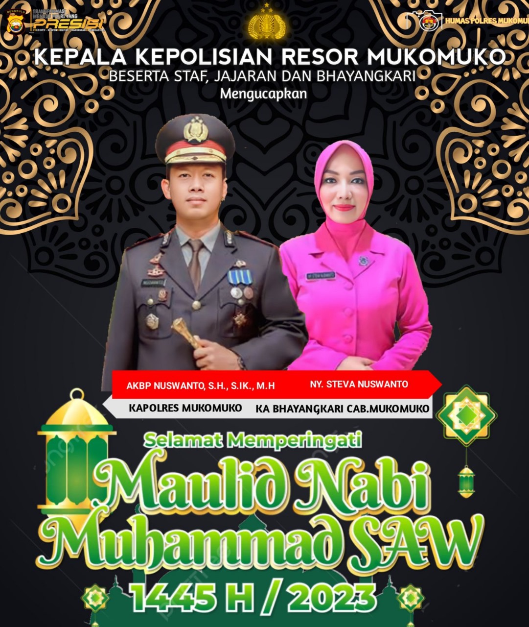 Kapolres Mukomuko AKBP Nuswanto S.H., S.I.K., M.H., beserta staf dan jajaran mengucapkan Selamat Maulid Nabi Muhammad SAW 12 Rabiul Awal 1445 H. Kapolres berpesan untuk terus menggaungkan Sholawat diwaktu senggang maupun disela-sela kesibukan.