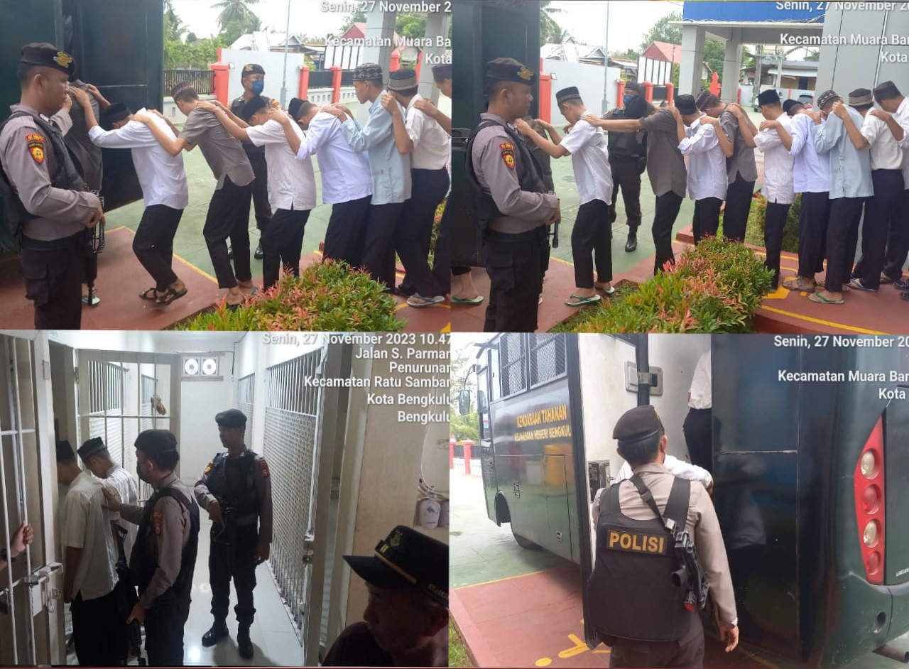 Bengkulu – Personel Sat Samapta Polresta Bengkulu Polda Bengkulu, melaksanakan kegiatan pengawalan tahanan umum dari kantor Rutan Marlbrough menuju Kantor Pengadilan Negeri (PN) Bengkulu, Senin (27/11/2023).