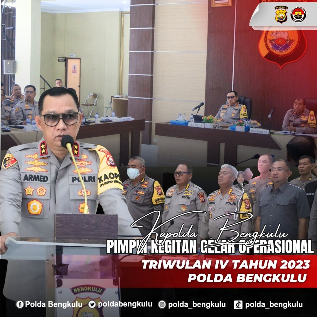 Bengkulu – Kepala Kepolisian Daerah Bengkulu Irjen Pol Drs. Armed Wijaya M.H., didampingi Wakapolda Bengkulu Brigjen Pol Agus Salim, membuka kegiatan Gelar Operasi (GO) Triwulan IV Polda Bengkulu T.A 2023, Kamis (28/12/23) Bertempat di Gedung Command Center Polda Bengkulu.