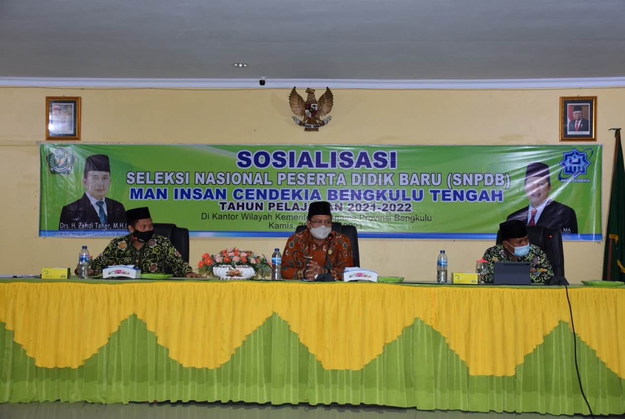Bengkulu,Siberindo.co – Tahun Ajaran Baru 2020/2021 sudah semakin dekat, berkaitan dengan hal ini Madrasah Aliyah Negeri Insan Cendikia (MAN IC) melaksanakan Sosialisasi Nasional Peserta Didik Baru (SNPDB) kepada Kepala Madrasah Tsanawiyah (MTS) Kabupaten Kota se Provinsi Bengkulu. Kegiatan dilaksanakan di Aula Kantor Wilayah Kementerian Agama Provinsi Bengkulu yang langsung dihadiri oleh Kabid Pendidikan Madrasah DR.H.Juni Muslimin,MA dan Kepala MAN IC Imam Gozali,M.Pd, Kamis (28/01/2021).