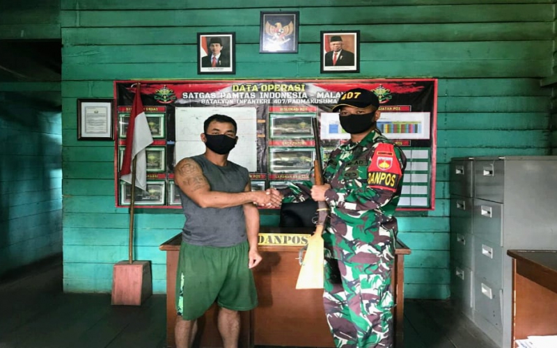 Penyerahan barang ilegal tersebut tepatnya di Pos Muakan dipimpin Danpos Muakan Serka Hidayah Purwo Saputro berupa 1 pucuk senjata laras panjang jenis Penabur beserta 1 butir munisi dari dari Saudara Ali (36) yang merupakan masyarakat Desa Muakan Petinggi, Kecamatan Ketungau Hulu, Kabupaten Sintang. Kamis (28/01/2021)