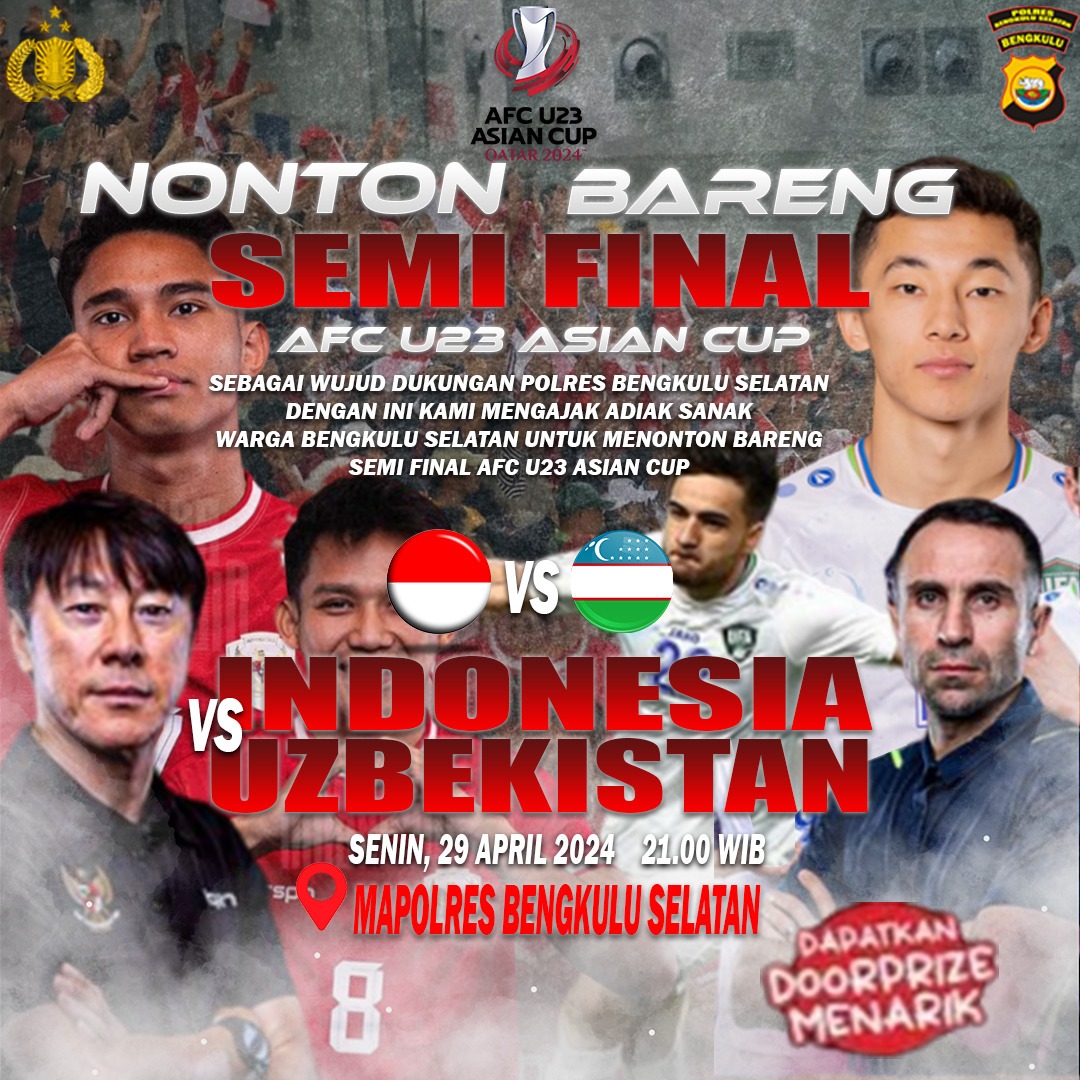Ayo kita dukung dan doakan langkah garuda muda mencetak sejarah baru menuju Olimpiade Paris 2024, terkhusus Kapolres dan Polsek Jajaran melaksanakan Nonton Bareng ( Nobar) ditempat masing masing pada Senin 29 April 2024 malam nanti,” ujarnya.