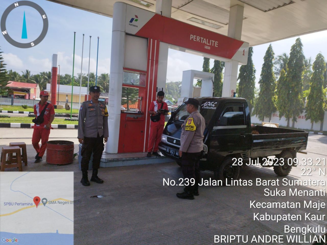 Kaur – Polsek Maje Polres Kaur Polda Bengkulu, melakukan pengamanan dan pengawasan di SPBU Air Numan Jaya Desa Suka Menanti Kecamtan Maje Kabupaten Kaur terkait Pendistribusian/Pengisian BBM terutama Jenis Pertalite dan Bio Solar, Minggu (23/07/2023).