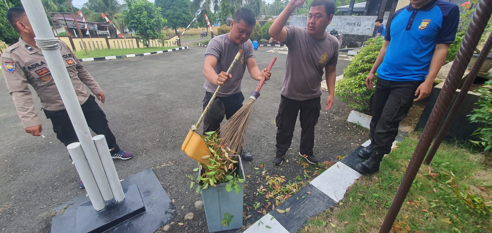 Tampak Personel Polsek Giri Mulya bersama bahu membahu dalam membersihkan lingkungan Mako.