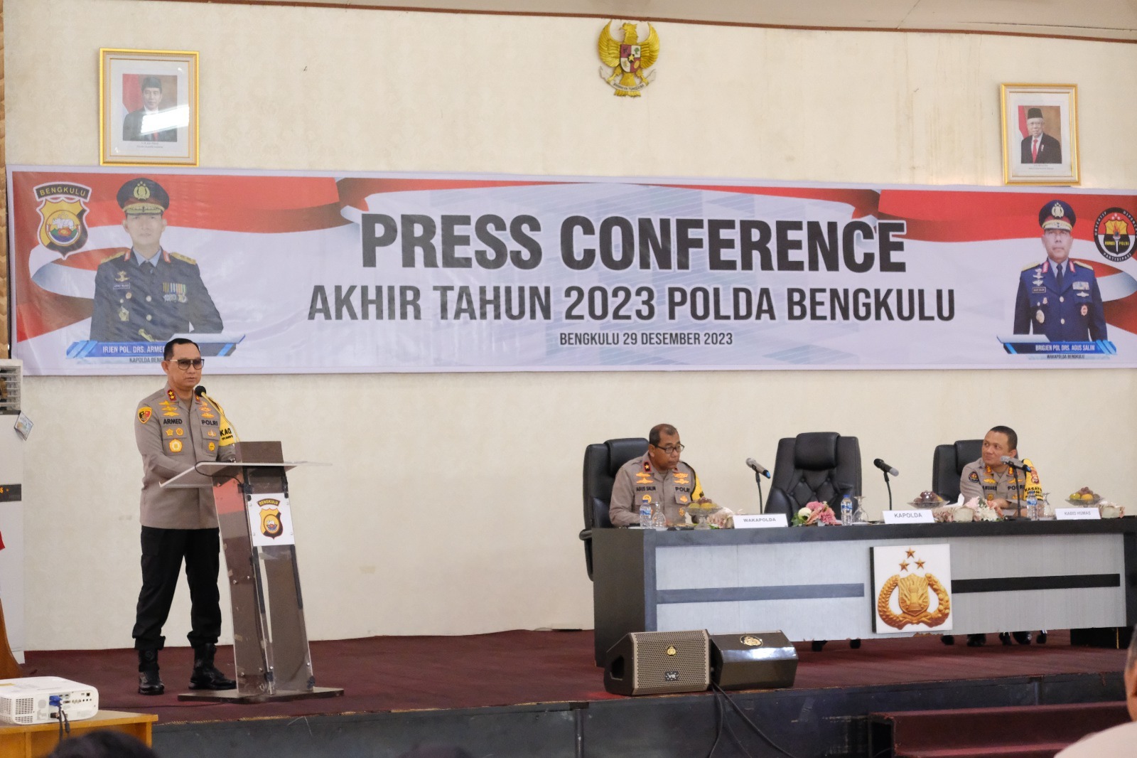 Bengkulu – Kepolisian Daerah Bengkulu menggelar Konferensi Pers Akhir Tahun 2023 bertempat di Gedung Adem Polda Bengkulu, Jum’at (29/12/2023). Kegiatan ini dihadiri langsung oleh Kapolda Bengkulu, Irjen Pol. Drs. Armed Wijaya, MH Gubernur Bengkulu Rohidin Mersyah, Wakapolda Bengkulu Brigjen pol. Drs. Agus Salim,Pejabat Utama (PJU), Forkopimda Provinsi Bengkulu, General Manager beserta awak media Provinsi Bengkulu.