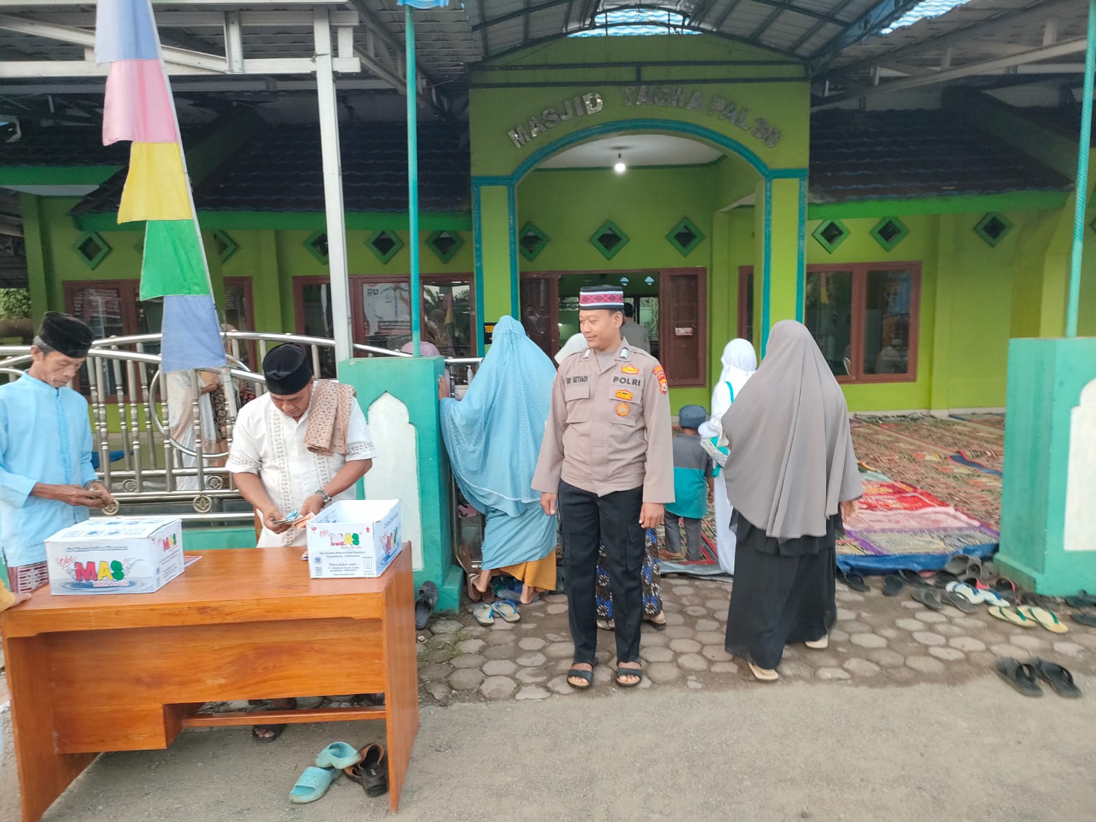 Warga tampak berdatangan bersama keluarganya untuk melaksanakan sholat Idul Adha, dan personel polsek Lais berjaga di depan mesjid dan juga mengatur lalu lintas di jalan raya depan mesjid serta mengatur parkiran kendaraan jemaah sholat Idul Adha.