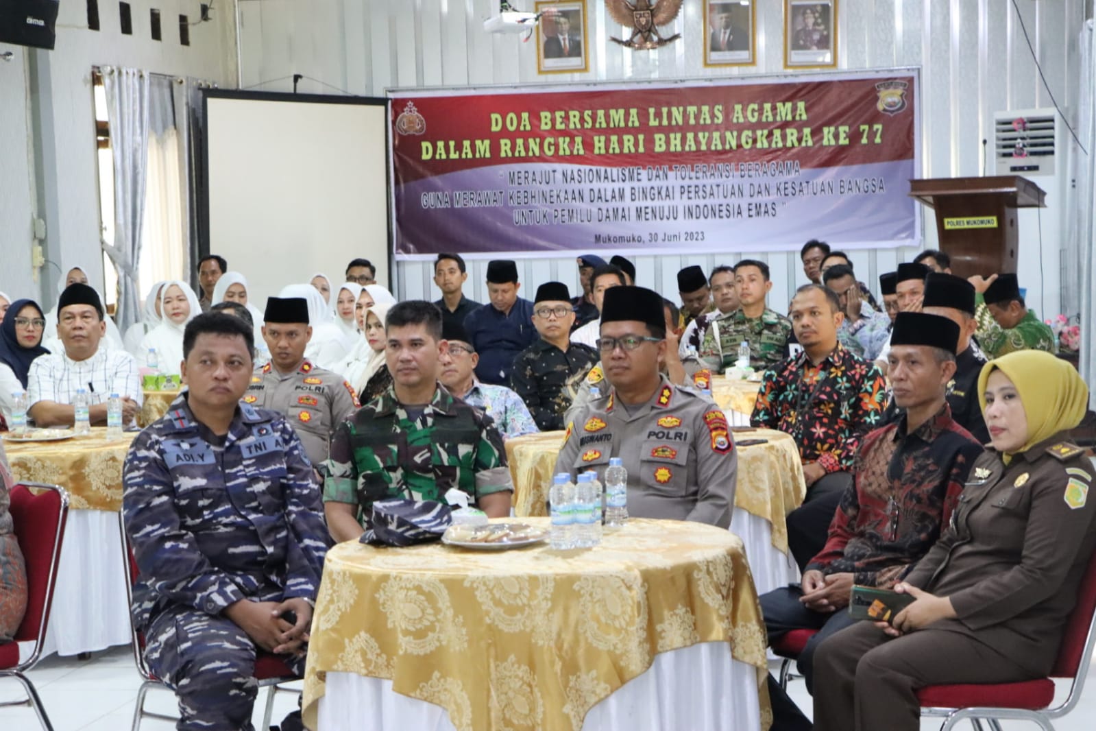 Mukomuko – Dalam Rangka Hari Bhayangkara Ke-77 Tahun 2023 Polres Mukomuko melaksanakan Doa bersama lintas agama secara virtual dengan mengambil Tema “Merajut Nasionalisme Dan Toleransi Beragama Guna Merawat Kebhinekaan Dalam Bingkai Persatuan Dan Kesatuan Bangsa Untuk Pemilu Damai Menuju Indonesia Maju” di Aula Polres Mukomuko, Jumat (30/06/2023).