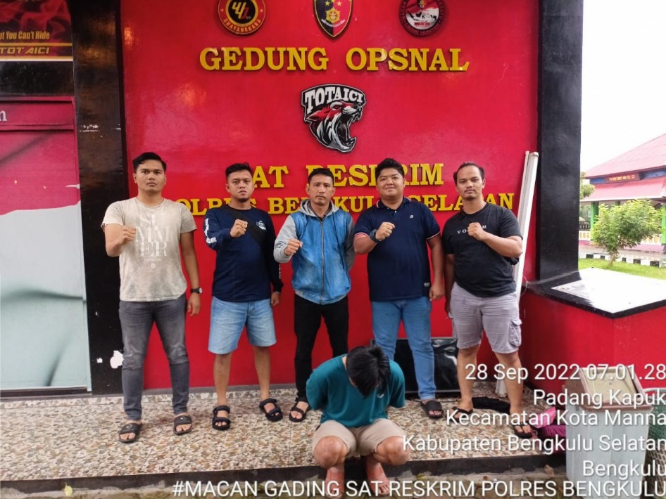 Kapolres Bengkulu AKBP Andi Daddy Nurcahyo Widodo S.IK M.H melalui Kasie Humas AKP Sugiharto dalam releasenya kemarin (28/09/22) menyampaikan, tersangka ditangkap pihaknya pada hari, Rabu tanggal 28 September 2022 Sekira pukul 07.00 WIB di Desa Suka Raja Kecamatan Kedurang Ilir Bengkulu Selatan (BS).