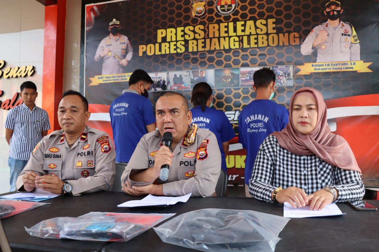 “Tersangka SU yang kita tangkap lebih dulu ini mendapat data dari Ha dan Ay. Ha dan Ay ini lebih dulu memeras korban sebesar Rp 500 ribu. Kemudian data itu diberikan kepada tersangka SU dengan perjanjian hasilnya nanti akan dibagi dua. Kemudian, dari hasil SU memeras korban, keduanya diberi uang Rp 500 ribu dan dijanjikan akan diberi lagi Rp 500 ribu jika korban memenuhi janjinya. Setelah itu, keduanya tidak berkomunikasi lagi dan mendengar bahwa SU telah kami tangkap. Keduanya kemudian kami amankan,” terang Kapolres Rejang Lebong Polda Bengkulu AKBP Tonny Kurniawan, S.I.K., saat press release di Mapolres, Jumat (30/9/2022), didampingi Kapolsek Bermani Ulu Ipda Ibnu Sina dan Kasi Humas Iptu Bertha Ginting.