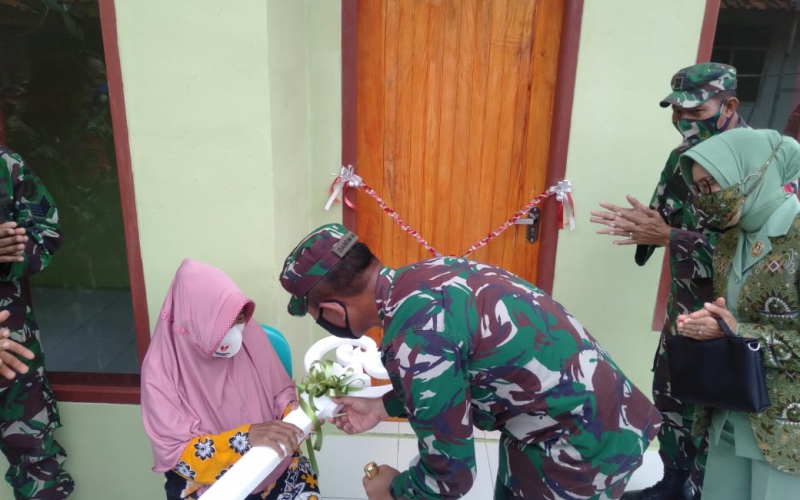 Dandim 0619/Purwakarta Letkol Arm Krisrantau Hermawan pimpin pelaksanaan penyerahan kunci rumah secara simbolis kepada ibu Sariah warga kampung Ciraharja desa Pasawahan, Kecamatan Pasawahan yang menerima bantuan rehab Rumah Tidak Layak Huni (Rutilahu) dari program Karya Bhakti TNI Kodim 0619/Purwakarta, Senin (30/11/2020).