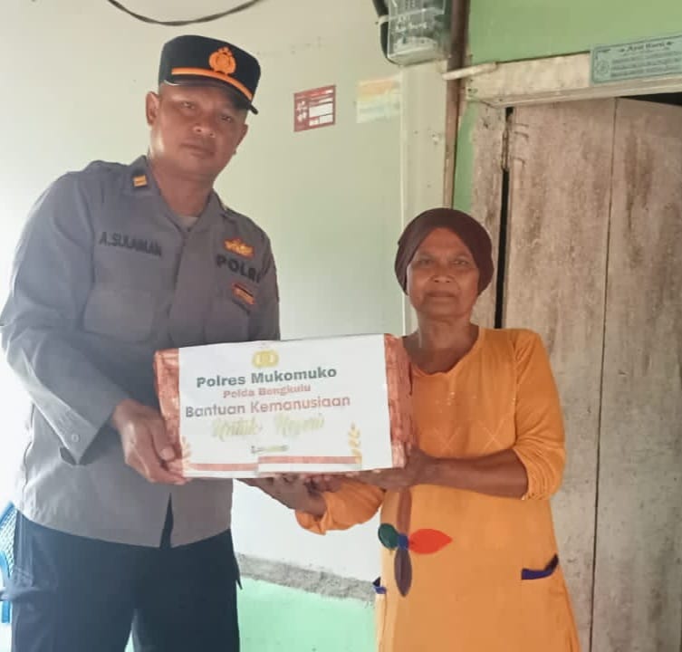 Mukomuko – Polres Mukomuko Polda Bengkulu melalui Polsek Mukomuko Selatan membagikan bantuan sosial kepada masyarakat di wilayah hukum Polsek Mukomuko Selatan yang kurang mampu, Jumat (31/3/23).