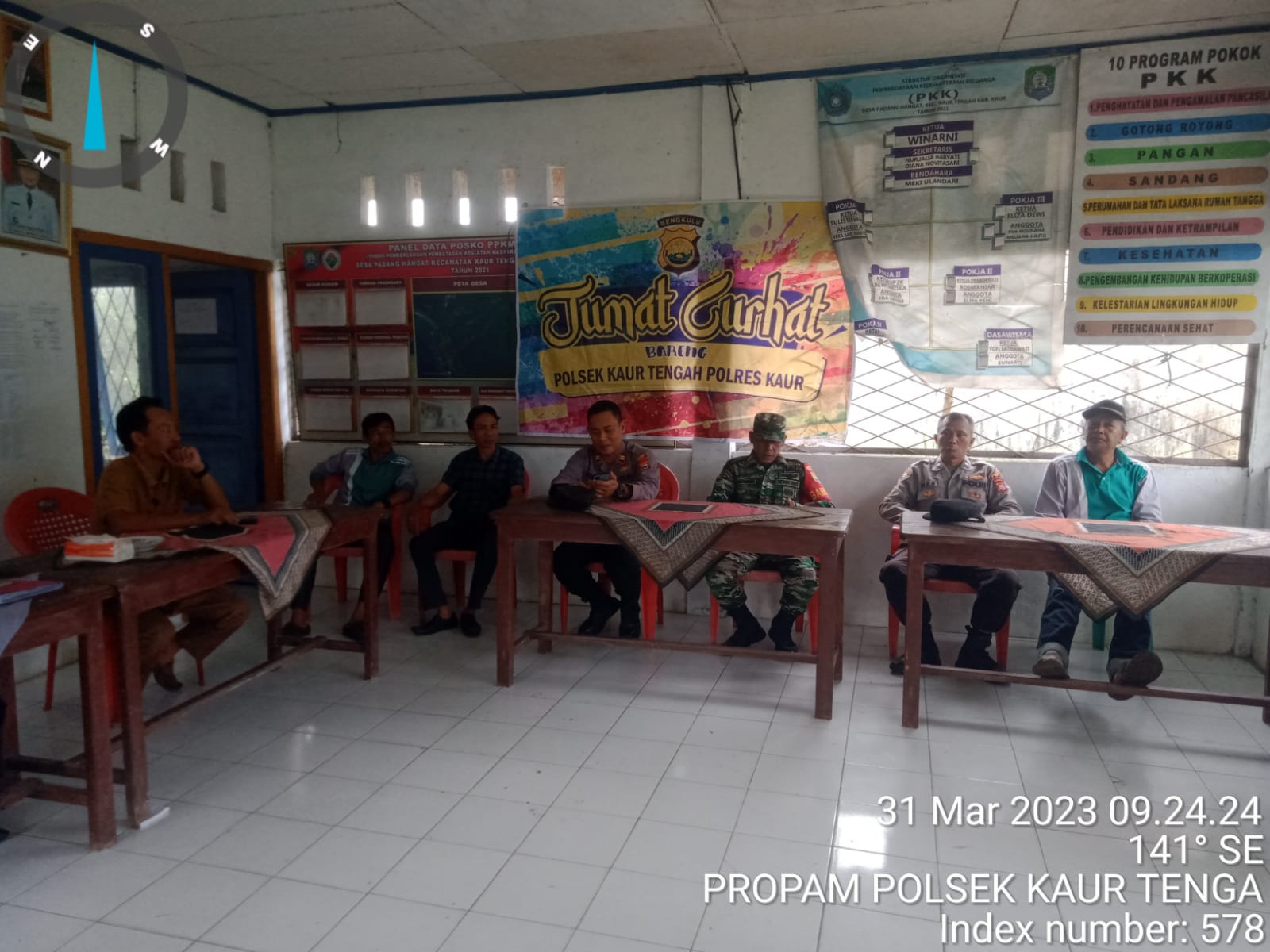 Kaur – Polsek Kaur Tengah Polres Kaur Polda Bengkulu, menggelar Jumat Curhat di Balai Desa Padang Hangat Kecamatan Kaur Tengah Kabupaten Kaur, Jumat (31/3/2023).