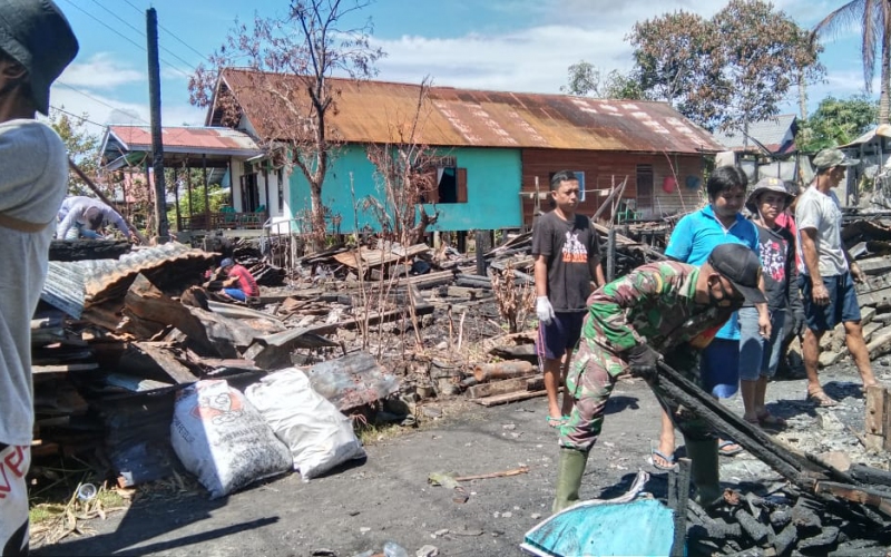 Bintara Pembina Desa (Babinsa) Koramil 1206-06/Putussibau Utara Serda Doni bersama masyarakat gotong royong membersihkan puing-puing bangunan pasca kebakaran di salah satu rumah Bpk Selamat RT 04/ RW 01, di Desa Kedamin Hilir Kec. Putussibau Selatan Kab. Kapuas Hulu.