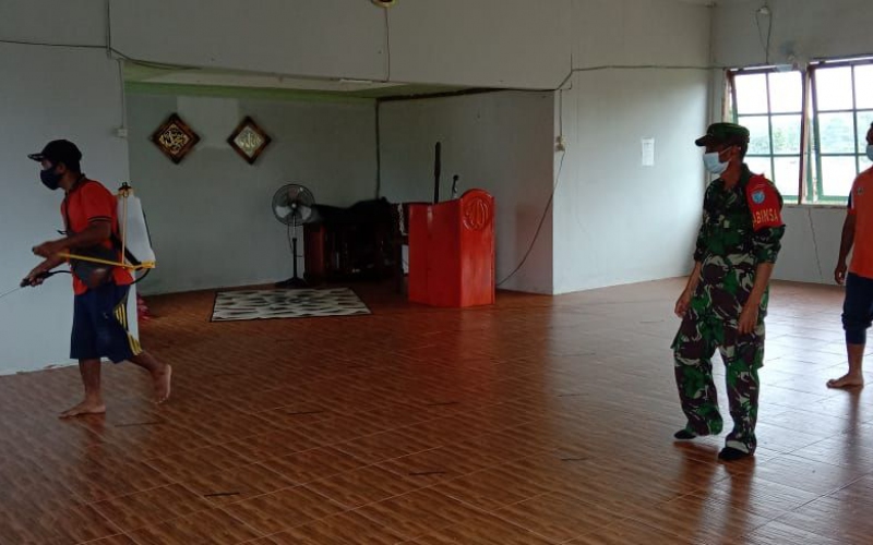 Demi mencegah penyebaran Covid-19, petugas gabungan Babinsa Koramil 1206-18/Puring Kencana melakukan penyemprotan cairan desinfektan, diseputaran tempat ibadah dan pemukiman warga di Kecamatan Puring Kencana, Kabupaten Kapuas Hulu, Sabtu (29/05/21).