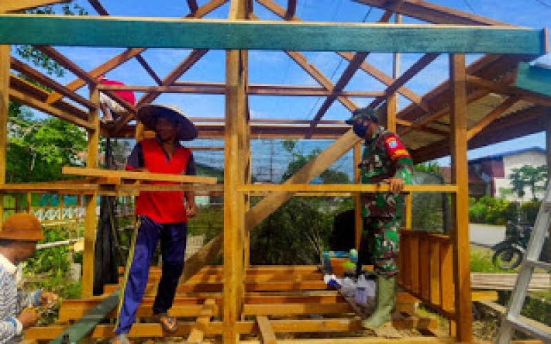 Terlihat Babinsa 1206-09/Jongkong Pengkadan Sertu Sumadi, Praka M.Zulfiqor bantu pengerjaan pembuatan Poskampling di Desa Mawan Kecamatan Pengkadan. Sabtu, (29/05/2021)