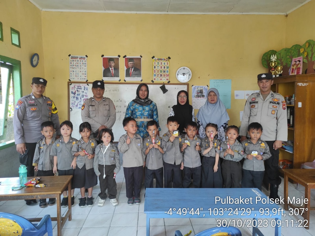 Dalam kegiatan Police Go To School itu, personel Personel Polsek Maje, menyampaikan imbauan kepada guru dan murid TK Paud Dharma Wanita II dalam rangka menciptakan Keamanan dan ketertiban di lingkungan sekolah.