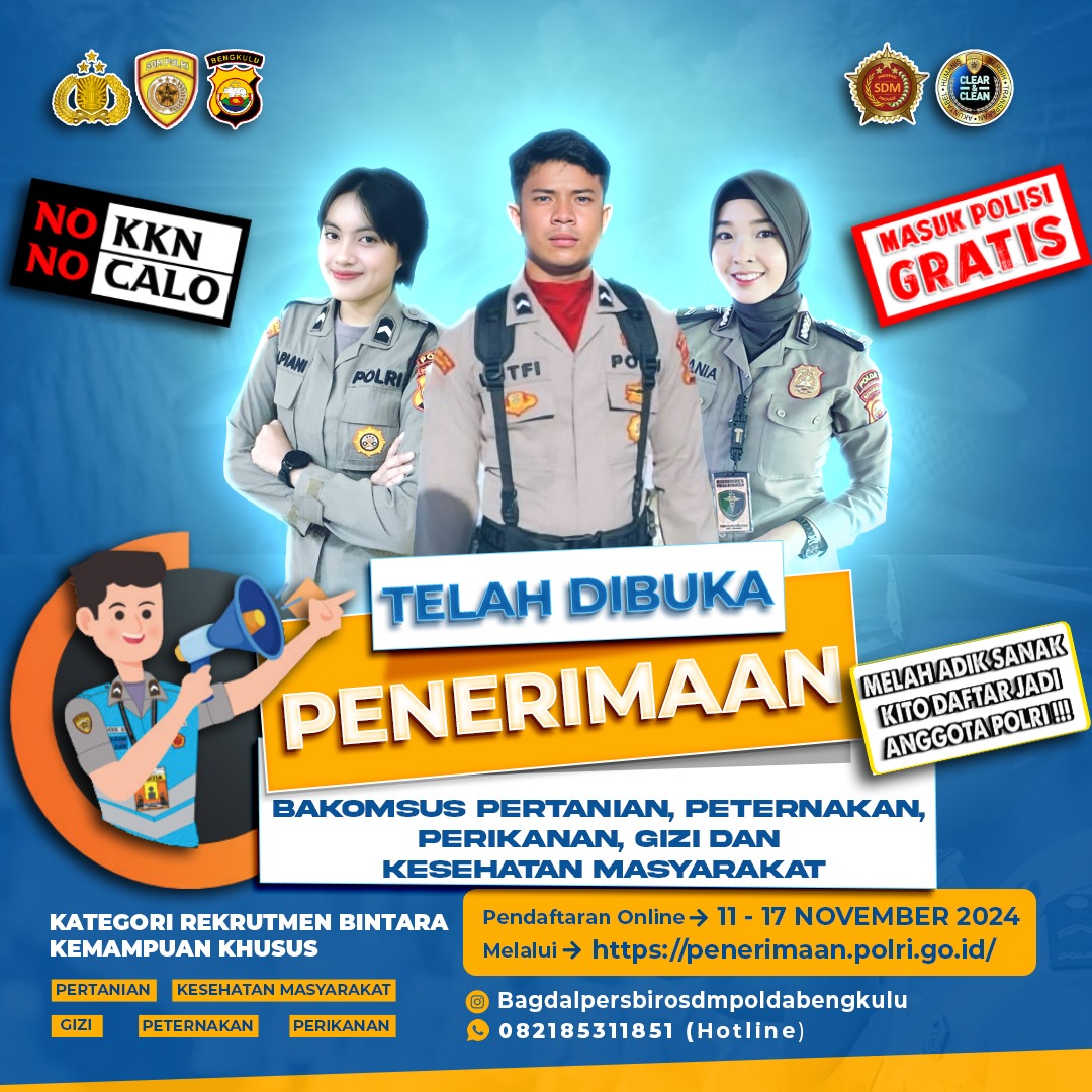 Bengkulu – Polda Bengkulu melalui Biro SDM akan melakukan rekruitmen Bintara Kompetensi Khusus (Bakomsus) TA 2024.