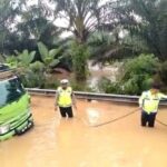 Terdampak Banjir, Pemotor Yang Ingin Melewati Jalan Di Bantu Oleh Personil Kodim 1206/PSB