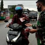 Sintang, Kalbar – hentikan pelintas jalan, itulah cara Batalyon Infanteri 642/Kapuas membagikan masker langsung, di jalan sengkuang, Kec. Sintang, Kab. Sintang, Kalimantan