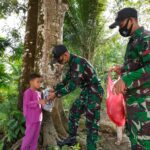 Kompi Senapan A Batalyon Infanteri 642/Kapuas Membagikan Masker Anak – Anak Di Sekitar Dusun Kenual Kec. Nanga Pinoh Kab. Melawi