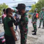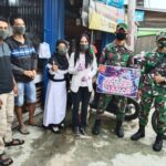 Sintang, Kalbar – hentikan pelintas jalan, itulah cara Batalyon Infanteri 642/Kapuas membagikan masker langsung, di jalan sengkuang, Kec. Sintang, Kab. Sintang,