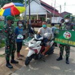 Melawi, Kalbar – menyekat di jalan, itulah cara Batalyon Infanteri 642/Kapuas membagikan masker langsung, di dusun Sidomulyo, Kec. Nanga pinoh, Kab. Melawi,