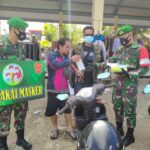 Sintang, Kalbar – hentikan pelintas jalan, itulah cara Batalyon Infanteri 642/Kapuas membagikan masker langsung, di jalan sengkuang, Kec. Sintang, Kab. Sintang, Kalimantan