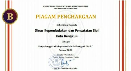 Bengkulu, Siberindo.co – Pemerintah Kota (Pemkot) Bengkulu melalui Dinas Kependudukan dan Catatan Sipil (Dukcapil) meraih predikat sebagai unit penyelenggara pelayanan publik kategori