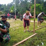 Satgas Pamtas RI-Malaysia Yonif 407/PK bersama masyarakat melaksanakan karya bakti Pembuatan pagar di Balai Desa Jasa, Dusun Wakampuh, Desa Jasa, Kecamatan Ketungau