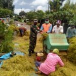 Babinsa Glonggong Koramil 13 Sambi Kodim0724/Boyolali Sertu Wahyono turut serta membantu pelaksanaan panen padi jenis Inpari di lahan milik warga binaannya Bapak