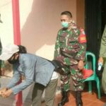 Babinsa Koramil 1201-09/Sengah Temilla mengedukasi para Linmas Desa Keranji Mancal untuk mengajarkan warga cuci tangan dan memakai masker sebagai pelopor penerapan protokol
