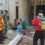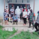 Anggota Koramil 12/Air Besar, Serda Lipsin bersama petugas dari Puskesmas Serimbu dan relawan Covid-19 melaksanakan penyemprotan disinfektan di lingkungan rumah salah seorang