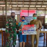 Babinsa Ariung Mendalam Praka Dedik Sulistiyo Anggota TNI dari Koramil 06/Putussibau Utara Kodim 1206/PSB membantu menyalurkan Bantuan Langsung Tunai (BLT) Dana Desa