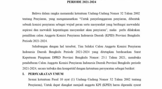 Bengkulu, Siberindo.co – DPRD Provinsi Bengkulu mulai melaksanakan Seleksi Calon Anggota KPID Provinsi Bengkulu untuk Periode 2021-2024 sebagaimana dimuat dalam Pengumuman Nomor:
