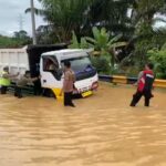 Polisi Bersama Warga Gotong Royong Evakuasi Truk Terjebak Banjir