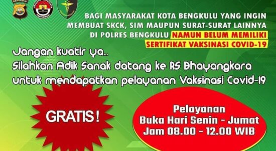 Bengkulu, Siberindo.co – Rumah Sakit Bhayangkara Bengkulu kembali menggelar Vaksinasi Covid-19 secara gratis. Vaksin kali ini diperuntukkan bagi masyarakat umum. Kabid Humas