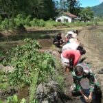 Landak-Babinsa Koramil 1201-06/Menjalin Sertu Masro bersama petani melaksanakan kerja bakti membersihkan dan membuat saluran irigasi persawahan di Dusun Sui Bandung Kecamatan Menjalin
