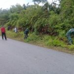 Landak – Babinsa Koramil 06/Menjalin, Sertu Masro bersama masyarakat melaksanakan gotong royong membersihkan jalan yang berada di Desa Tempoak, Kecamatan Menjalin Kabupaten